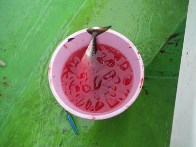 船上で〆るとこうなる、着ているもの全てに血が飛び散り